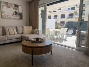 The main living area is bright and welcoming, opening onto a spacious west-facing terrace. Large glass doors allow natural light to fill the interior while creating a natural flow between the living room and the outdoor space. The terrace offers ample room for both lounge seating and outdoor dining, making it an ideal setting for relaxed evenings and entertaining.