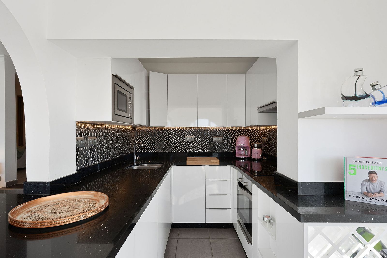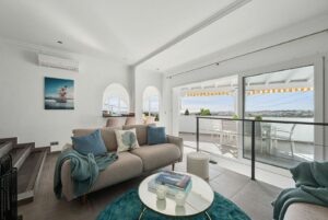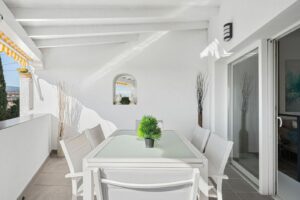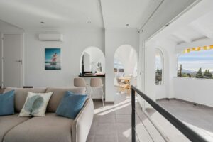 Lovely 3 bedroom house with uninterrupted sea views and walking distance to all local amenities. Located on a quiet one way street in the heart of La Campana, this house benefits from 3 ample bedrooms, each with its own en suite bathroom as well as a guest toilet. The living room opens on to a 18m2 terrace with views over the sea, Gibraltar and Africa. The house faces south/west and has afternoon sun to the living room and kitchen as well as a spectacular sunset. The third bedroom is located on the ground floor with its own access door, perfect for guests or older children. It comes fully equipped with AC throughout, a fully fitted kitchen as well as two storage rooms with washing machine, shelving, and electric water boilers. Furthermore, there is a second outdoor terrace located near the entrance to the plot surrounded by beautiful flowering Buganvillas and Hibiscus plants.