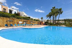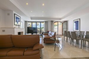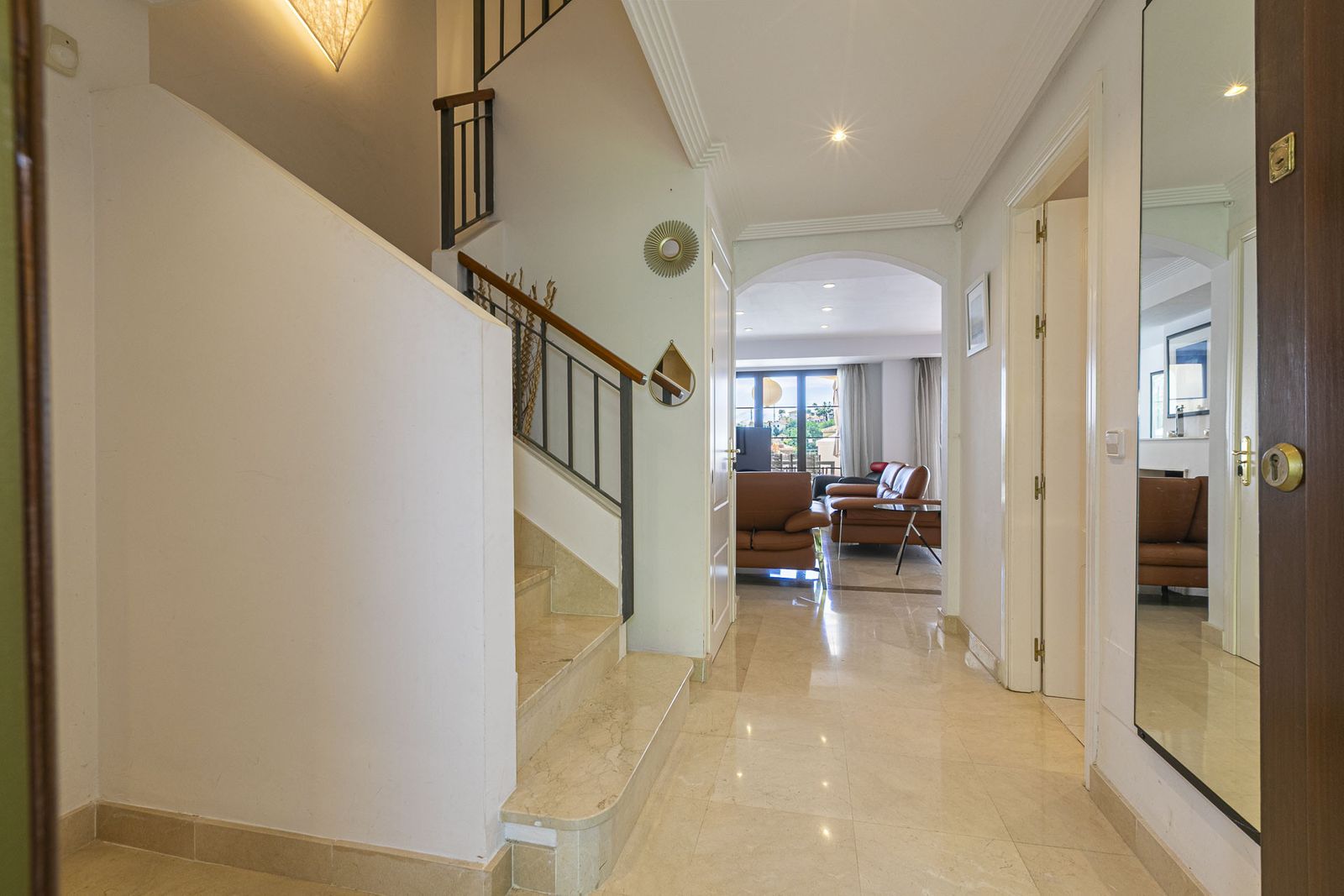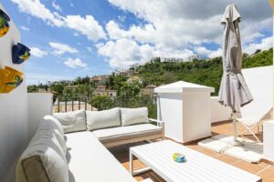 Beautiful south-facing, three bedroom townhouse in Los Almendros, part of the secure Los Arqueros Golf community in Benahavís. On the ground level you will find a modern and bright living and dining area with fireplace, fully fitted kitchen, guest toilet and a large terrace for outdoor dining and sunset views. The newly renovated kitchen includes stone worktops, Siemens appliances, and a separate utility room. Upstairs, the main bedroom has its own terrace and en-suite bathroom, while two additional double bedrooms share a family bathroom. The lower level includes a flexible space that can be used as a guest suite, office, gym, or small apartment, along with a new full bathroom and direct access to a private garage with ample storage. The community offers two shared pools set in mature gardens and is conveniently located near golf courses, beaches, hiking trails, restaurants, and international schools.