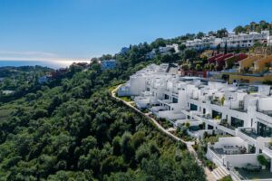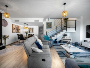 Casa Altavista is a south east facing luxury townhouse for sale with panoramic mountain sea and coastal views. It offers three bedrooms and three ensuite bathrooms within 172 m2 built. The modern spacious kitchen has a view and direct access to the internal patio. Open plan living and dining areas lead to the main terrace with a gate to a small private garden. The home includes air conditioning central heating a wood burning fireplace two private parking spaces and a storage room.