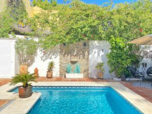 Around the pool is a chill-out area with sun loungers, an outdoor kitchen with a barbecue, and a bar area. Traditional elements such as terracotta floors, solid wood doors and windows, and beamed ceilings characterize the architecture of this charming house.