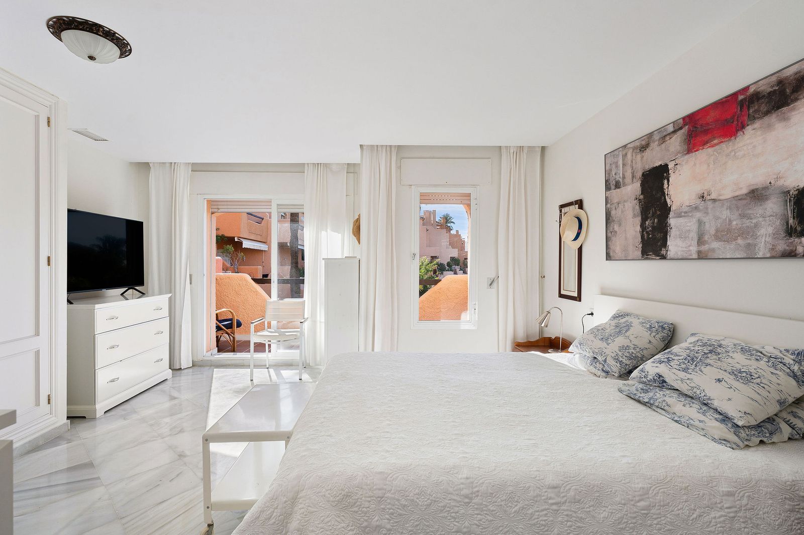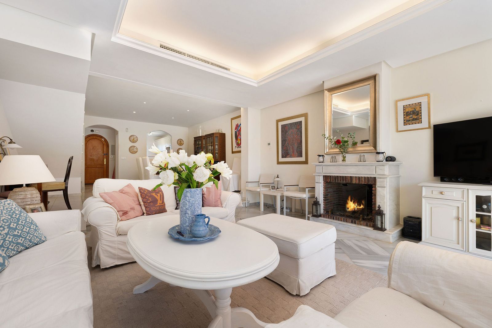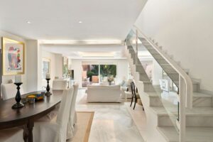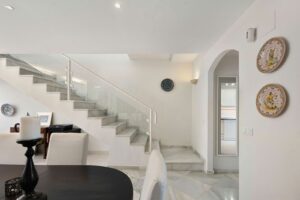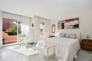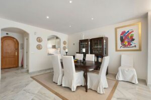 This well presented three-bedroom townhouse spans three spacious levels, combining comfort, space, and a great location in the heart of Nueva Andalucía. A wide selection of restaurants, cafés, bars, and boutiques are within walking distance, while Puerto Banús, sandy beaches, and renowned golf courses are just minutes away. The main floor features a well-sized kitchen with a separate utility room and a split-level dining and living area with an open fireplace. Doors lead to a private terrace with direct access to the communal gardens and swimming pool. All three generous bedrooms have private terraces. The top-floor suite stands out with a large private terrace and an additional terrace with built-in BBQ and open garden views — perfect for outdoor dining and entertaining. Additional features include a private driveway, spacious garage, three en-suite bathrooms, and a guest wc. Located within the sought-after El Palmeral community of just 46 townhouses, residents enjoy two swimming pools, a heated outdoor jacuzzi, sauna, gym, and beautifully maintained gardens in a secure and peaceful setting. A superb opportunity to own a large home in one of Marbella’s most desirable areas.