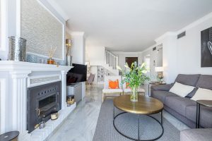 The property features a fully fitted designer kitchen equipped with an American-style fridge-freezer with water and ice dispenser. The bright and spacious living room, complete with a cosy fireplace, opens onto a generous sunny terrace, off which there is a useful outside utility area, adding excellent practicality. The terrace enjoys panoramic views of La Concha and Puerto Banús.