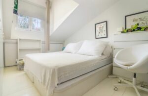 Spanning two floors, the townhouse features a first-floor living area complete with a cozy fireplace and windows that lead to a terrace and a well-maintained private garden, tended to by community gardeners. The kitchen is seamlessly integrated into the living space, and there's a convenient guest toilet for added comfort.