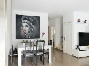 Upstairs, the home boasts three well-appointed bedrooms, each with built-in wardrobes for optimal storage. The spacious master bedroom benefits from two private terraces, creating additional areas to enjoy the fresh air and sunshine. A large family bathroom serves this floor, combining comfort and functionality.