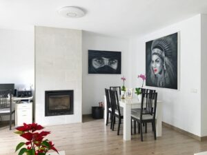 The main floor features a bright and inviting living room with a cozy fireplace, seamlessly flowing into the dining area. The fireplace includes a system that allows the generated heat to be distributed to other areas of the house including the bedrooms. The fully equipped and renovated kitchen is designed for practicality, while a bathroom with shower adds to the convenience of this level. The living area extends onto a private terrace, offering a tranquil outdoor space to relax or entertain.