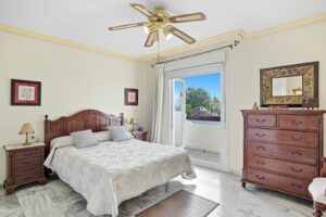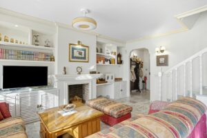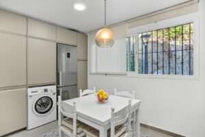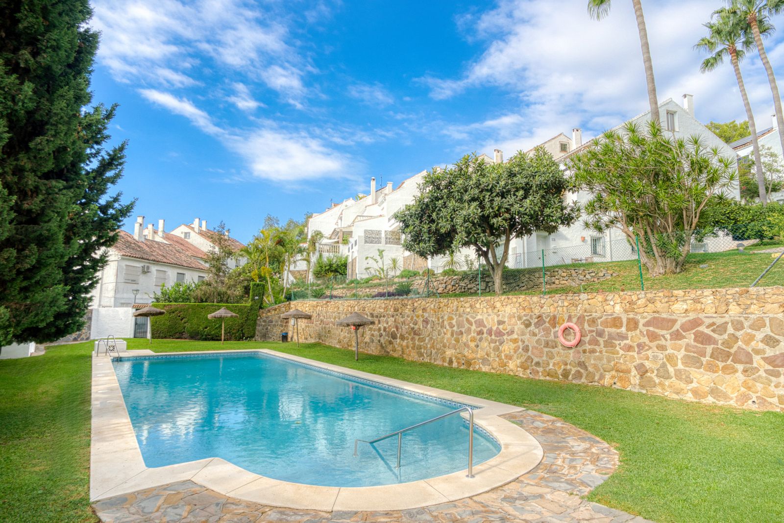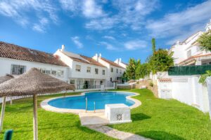 This lovely three-bedroom, south-facing townhouse is set in the sought-after gated community of El Capricho on Marbella’s Golden Mile, offering spacious tropical gardens and two communal swimming pools. Ideally located within walking distance to the beach, bars, and restaurants, and just a short drive from Marbella Center and Puerto Banús, the property combines convenience with charm. The ground floor features a bright living and dining area with a fireplace and access to a generous terrace perfect for outdoor dining, a newly renovated separate kitchen, and a guest toilet. Stairs lead down to a large basement currently used as a bedroom and art studio with its own bathroom. Upstairs, the master suite is accompanied by two guest bedrooms and a family bathroom. Additional highlights include fitted wardrobes, marble floors, and private parking for one car.