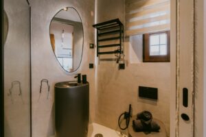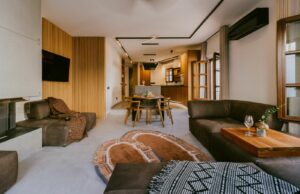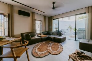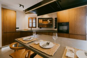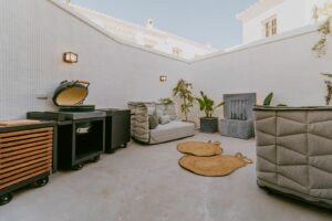 The open-plan living and dining area is bathed in natural light, providing a luxurious yet comfortable space with a real wood fireplace, perfect for relaxing or entertaining. Expansive glass doors lead to a private Andalusian-style patio, offering a serene retreat for outdoor relaxation.