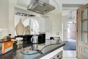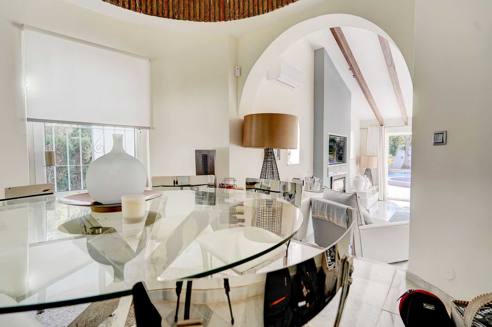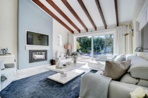 Inside, the villa features spacious, light-filled rooms with large windows throughout. The split-level lounge is a standout feature, with double-height ceilings, exposed wooden beams and a fireplace, creating a warm yet impressive living space. Large windows frame a picture-postcard view of the garden and pool, filling the room with natural light. The elevated dining area connects directly to the fully fitted modern kitchen via a convenient serving hatch. There are three double bedrooms and two bathrooms, including a generous master suite with ensuite bathroom and an oversized walk-in wardrobe.