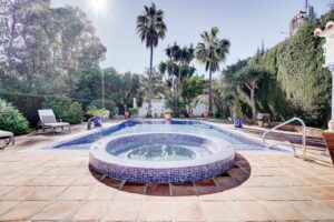 Located in Lower Calahonda in Mijas Costa, this private 3 bedroom villa for sale offers a rare opportunity to own a single-level Andalusian home just a short walk from the beach. Positioned in a quiet cul-de-sac of only three houses, the property sits on a generous 842m² plot and is completely private and not overlooked. Built in 1981 with classic Andalusian architecture, including two distinctive turrets with domed interiors, the villa blends character and charm with a modernised interior. The landscaped garden wraps around the home, framing a stunning 50m² swimming pool with jacuzzi, gazebo and a separate covered bar area — perfect for outdoor living.