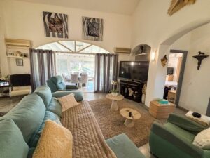 The house is built on one level, providing comfort and practicality throughout. The entrance hall leads to a large living room with high ceilings, bright and inviting, with direct access to a covered terrace overlooking the garden and swimming pool. Adjacent to the living room is a spacious, fully equipped kitchen, ideal for everyday living.
