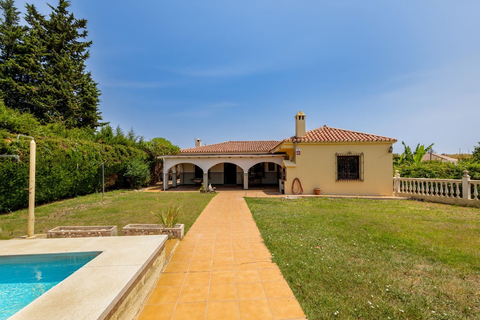 The plot, measuring over 3,500 m², is simply spectacular. With extensive gardens, space for outdoor activities, and a pet shed, it is ideal for nature lovers and those seeking a more relaxed lifestyle. Spread over two floors, the home features three bedrooms, three bathrooms (two masters and a guest toilet), and a spacious living room. Although it is currently in need of renovation, features such as built-in wardrobes, a swimming pool, and views of the golf courses make this property a diamond in the rough.