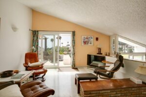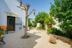 Second line beach villa in Estepona, the house has a beautiful courtyard entrance to the front of the house and fabulous private garden at the rear of the house. Entering the property you have 3 bedrooms and 2 bathrooms on the ground floor, upper level is kitchen, dining area and living room. The living room opens out onto a fantastic terrace with access down into the garden. The house has lovely views over the communal gardens and a little sea view, the beach and promenade are just a mere 50 meter walk. Within the community are 5 pools, tennis courts and communal Gym.