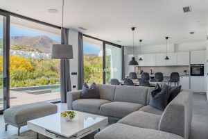 The heart of the home is its bright living-dining room with a modern open-plan kitchen, which opens directly onto a pleasant terrace and private garden, perfect for enjoying the natural surroundings and the Costa del Sol climate. The villa also includes a heated swimming pool and a cinema area, ideal for both relaxation and leisure.
