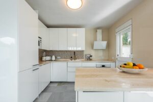 Inside, the villa boasts a bright and open layout with 3 bedrooms and 2 full bathrooms. The spacious living and dining area enjoys beautiful garden views and a cozy fireplace, while the modern open-plan kitchen with a central island seamlessly connects to the living space.