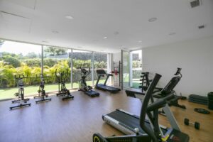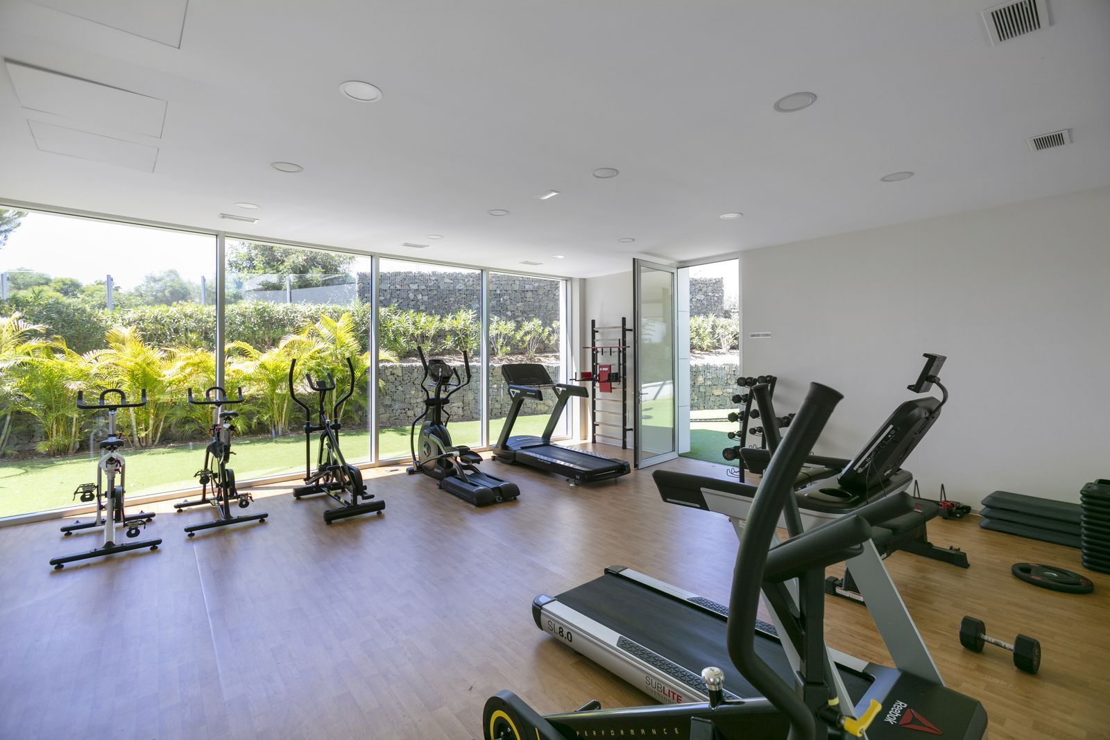a wellness area with an indoor heated pool, gym, and sauna,