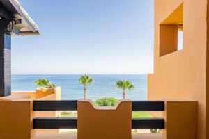 This fully remodelled 4 bedroom and 4 bathroom apartment is an amazing opportunity for people who are looking for luxury and comfort in a stunning beachfront location. The spacious living and dining room and the luxurious master bedroom with its en-suite bathroom and walk-in wardrobe both have direct access to the impressive south facing terrace with panoramic sea views. Los Granados del Mar is one of the most exclusive urbanizations on the New Golden Mile with breathtaking views of the Mediterranean Sea. Its combination of beautifully maintained gardens and luxurious facilities such as an on-site restaurant, a heated indoor pool, 2 outdoor pools, a gym, a sauna, a Jacuzzi and 24h security make this community one of a kind. It has direct beach access and is very close to all amenities, shops, schools, high class restaurants, the newly build Laguna complex and the center of Estepona. This bright 187 m² apartment boasts a brand-new open-concept designer kitchen with premium German appliances and luxurious extras, including a Bang & Olufsen sound system, an electric fireplace, and a freestanding bathtub. Underground parking with direct lift access to the apartment as well as a secure storage room are included in the price.
