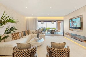 This stunning ground-floor apartment has been meticulously redesigned to the highest standards, combining contemporary elegance with timeless style. It is offered fully furnished with curated, high-end designer pieces, allowing you to move in and enjoy a luxurious lifestyle from day one. Large open-plan living areas seamlessly flow to the spacious terrace and private garden, where uninterrupted panoramic sea views stretch out before you — a perfect setting for relaxing, entertaining, or watching the sun dip below the horizon.
