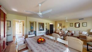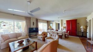 This elegant apartment, created by combining two properties, offers a unique space on a single floor with 4 spacious bedrooms and 4 bathrooms, two of which are en-suite. The layout features two separate entrances: one with direct access to the kitchen and the other leading to a bright entrance hall, from which you can access a large living room connected to a spacious covered terrace, ideal for enjoying the relaxing views of the golf course.