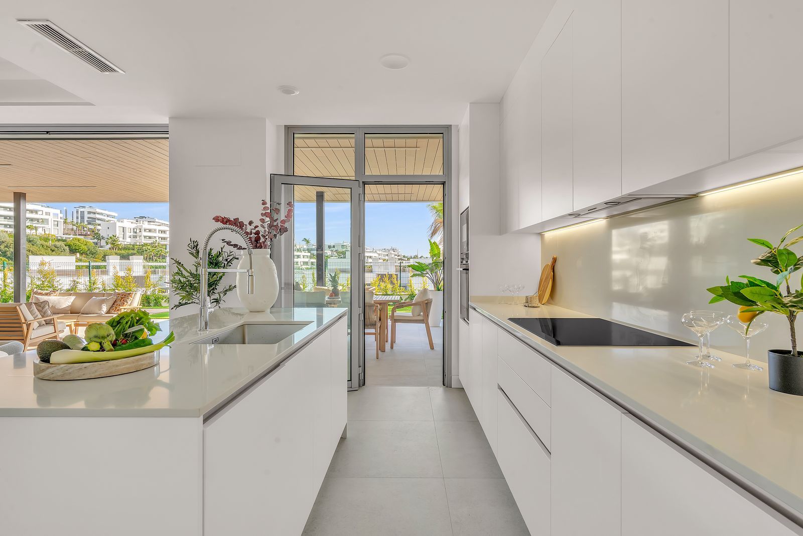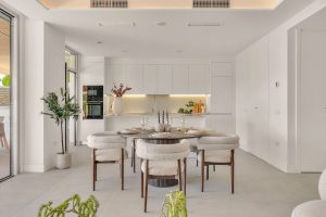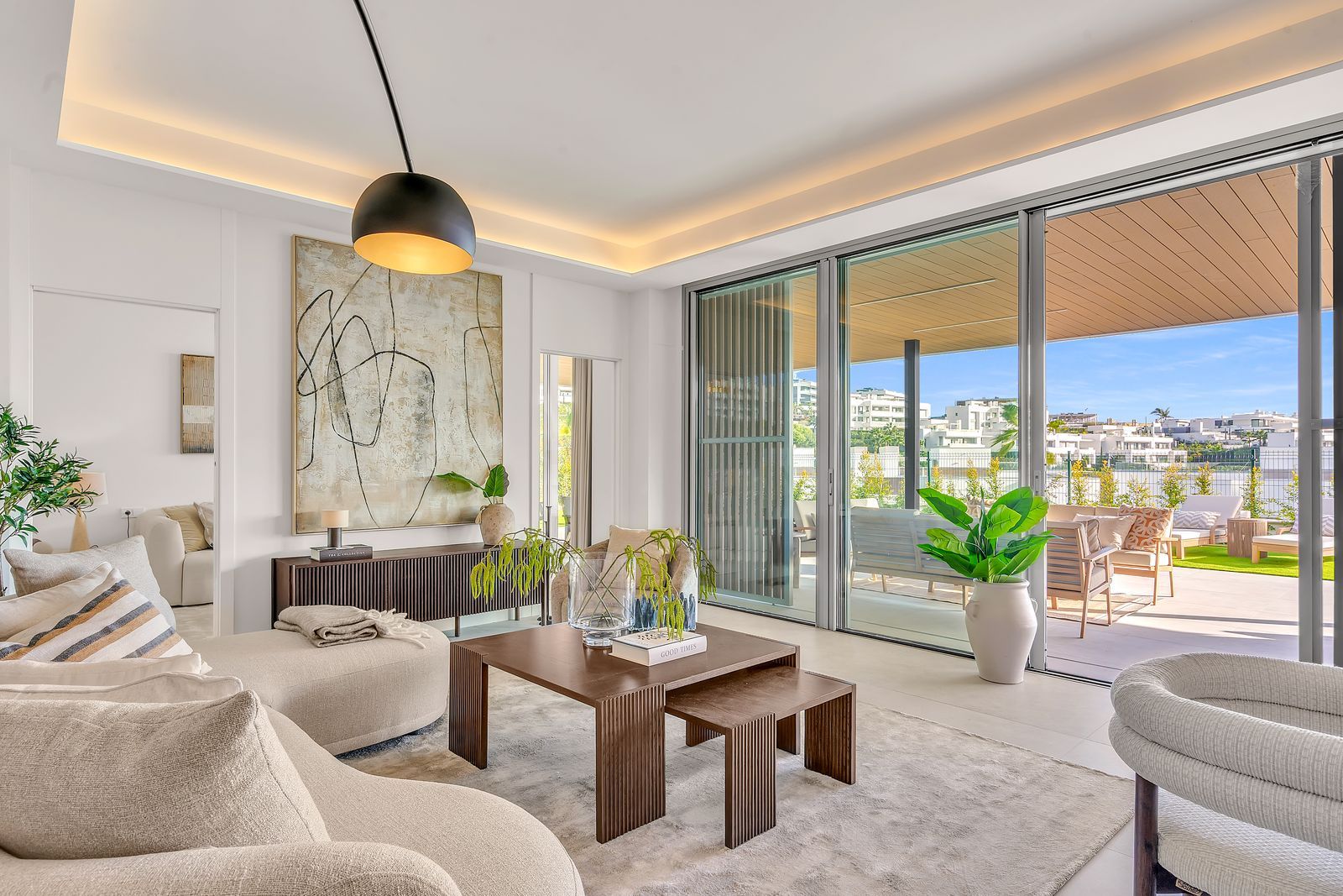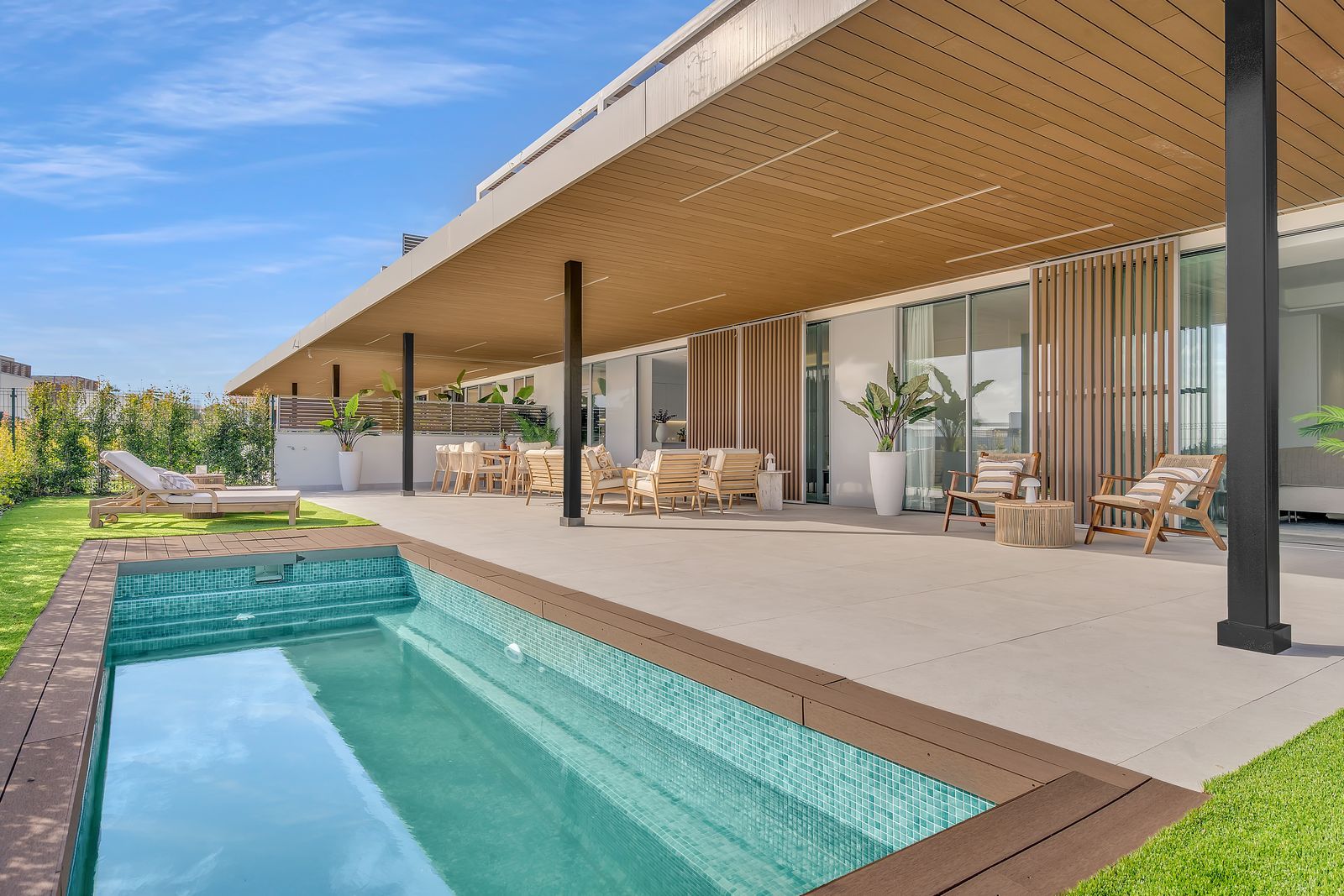 The spacious open-plan living and dining area flows effortlessly onto a large covered porch, private garden, and private swimming pool, creating an ideal setting for outdoor living, entertaining, and relaxation all year round.