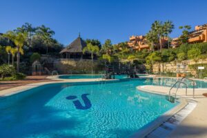 is a magnificent luxury residential complex located in La Cerquilla, one of the most exclusive and sought-after areas within the prestigious district of Nueva Andalucía, nestled between the renowned golf courses Las Brisas and Los Naranjos. The complex stands out for its impressive oasis-like appearance, featuring beautifully landscaped gardens that complement the elegant Mediterranean architecture, perfectly blending with the lush Andalusian hills overlooking the famous Golf Valley.
