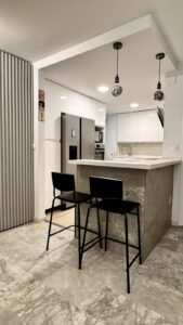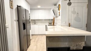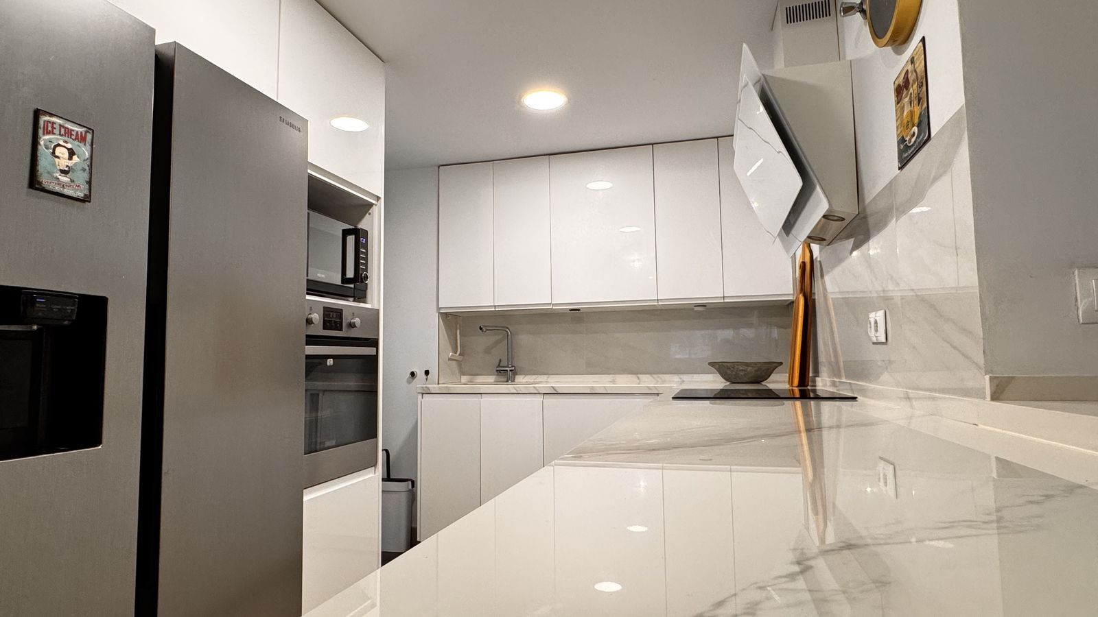 • Fully equipped white open-plan kitchen, renovated with stone countertops, generous storage and a side-by-side refrigerator.