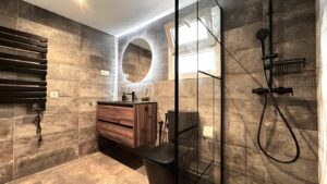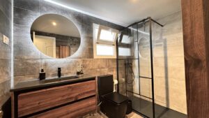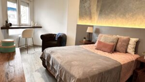 • 2 additional bedrooms — one with a desk and modern bunk bed (perfect for children or guests), and another with a single bed + pull-out bed and charming wooden house-style décor for kids.