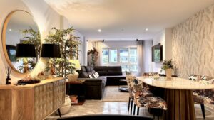 • Bright and elegant living room with large windows, a comfortable sofa, sophisticated dining area, and modern decor — ideal for relaxing or hosting.