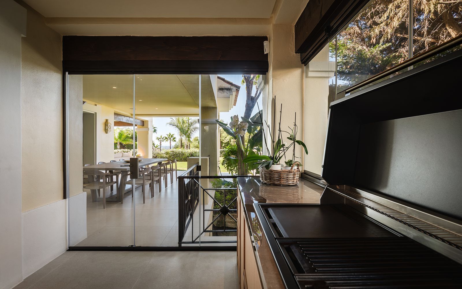 Designed across a single level for utmost comfort, the residence boasts a sophisticated layout. The custom wood-panelled entrance hall opens to a fully equipped open-plan Miele kitchen with an elegant breakfast bar, flowing seamlessly into a spacious living and dining area connected to a wraparound covered terrace and private garden with its own swimming pool. The property also benefits from a second Chef's kitchen featuring top-of-the-line equipment and fully enclosed with glass curtains that can be opened up completely during the warm summer days, converting it to your own fully functional outdoor kitchen.