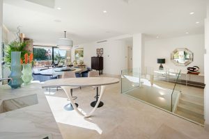 The interior palette is deliberate and unusually confident: deep burgundy, navy, soft blues, and warm natural tones layered through designer furnishings and curated artworks selected as part of Pedro Peña’s scheme. Nothing feels transient. Storage is properly considered, circulation is logical, and the proportions favour daily living over spectacle. Even the transition from garage to home is seamless: arrive, close the door, and the outside world recedes without ceremony. It raises a quiet question: should a luxury home impress visitors, or simply make its owners not want to leave?