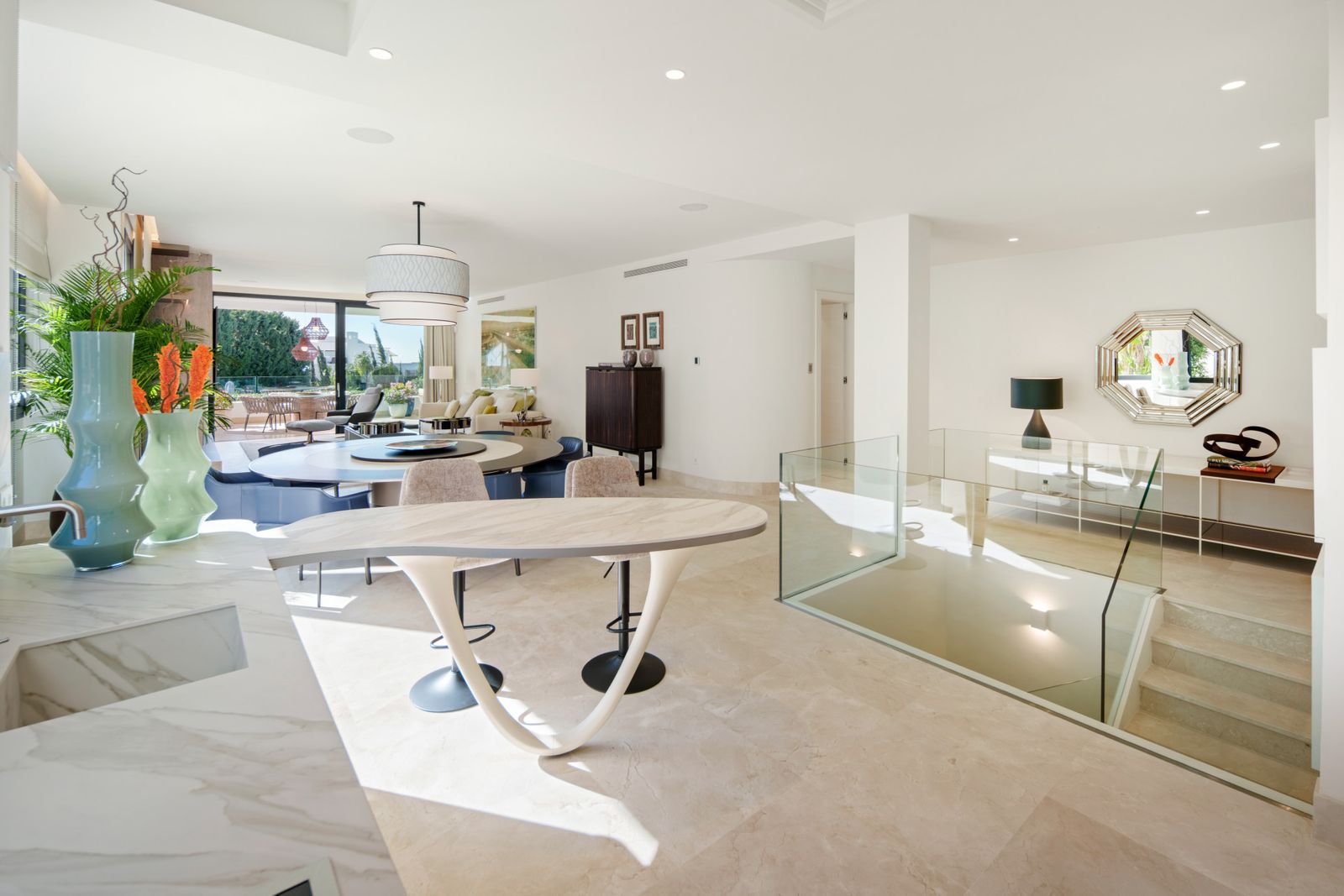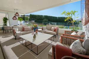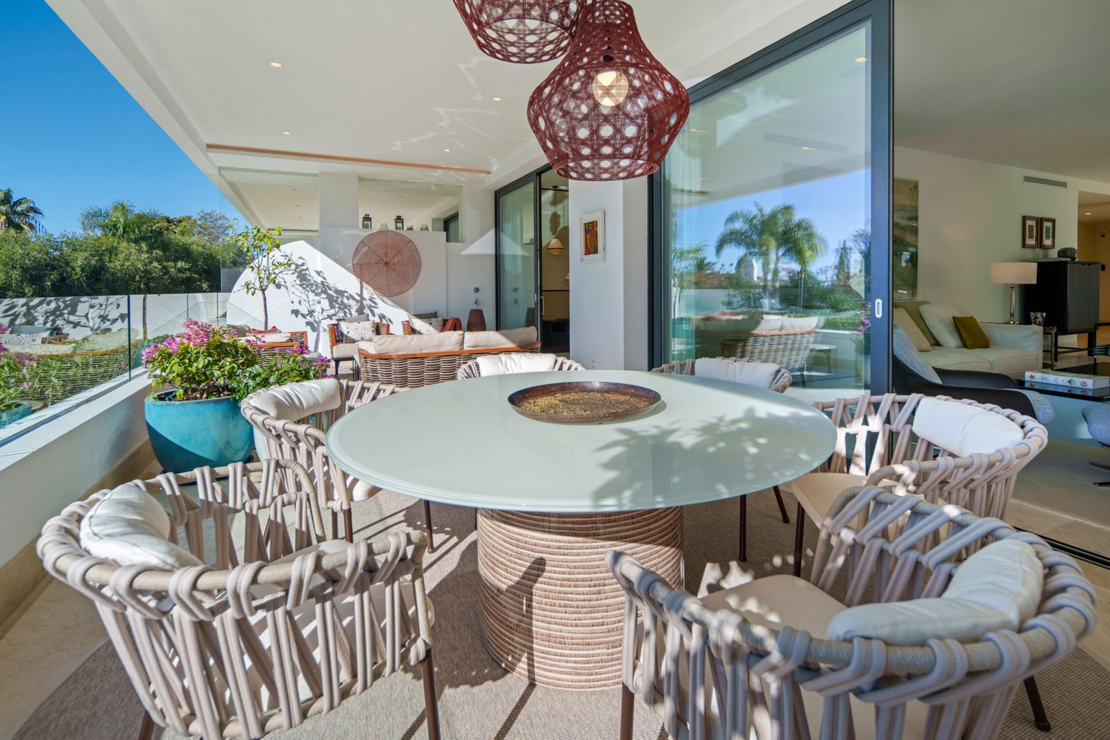 Atlas is a duplex ground-floor apartment in Reserva de Sierra Blanca offering four bedrooms, four bathrooms plus a guest cloakroom, arranged over a discreet entertainment level below and a calm main living floor above, with interiors by Pedro Peña, bespoke carpentry by Vaneva, technical installations by Proinsermant, climate systems by Technoclima, and a private terrace with garden and pool outlook, plus two internally accessed parking spaces.