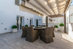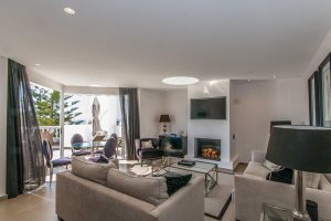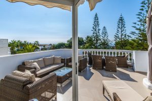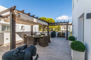 Immaculate, completely refurbished duplex penthouse in the popular beach urbanisation White Pearl Beach, just 150 meters from Elviria's best stretch of beach and walking distance to local shops, supermarkets, bars and restaurants. The lower levels consists of a three bedrooms and two bathrooms, a newly fitted kitchen with direct access to an ample terrace at the backside of the property with outside kitchen and barbecue, a bright and sunny lounge/dining area with fireplace and direct access to an ample south facing terrace with beautiful views of the mediterranean Sea, the communal gardens and pool. The upper floor offers a large bedroom with en-suite bathroom and another spacious terrace with jacuzzi and beautiful sea views. Arguably the best penthouse for sale in the development, this property is offered with all the furniture included and is ready to move in to. The community if fully gated, offers underground parking and has 24-hour security.