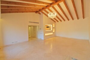The lower floor comprises four bedrooms, two with en-suite bathrooms and two bedrooms sharing a bathroom. The spacious living room boasts a double-height ceiling and access to the terrace. The fully equipped kitchen includes a utility room and garden views.