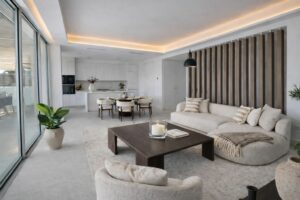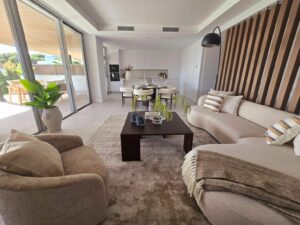 The property features a bright open-plan living area with large floor-to-ceiling windows that seamlessly integrate indoor and outdoor spaces. From the living room, there is access to a spacious 89 m² terrace, a beautifully maintained 159 m² private garden, and a 12 m² private swimming pool, creating the perfect setting to enjoy the Mediterranean lifestyle all year round.