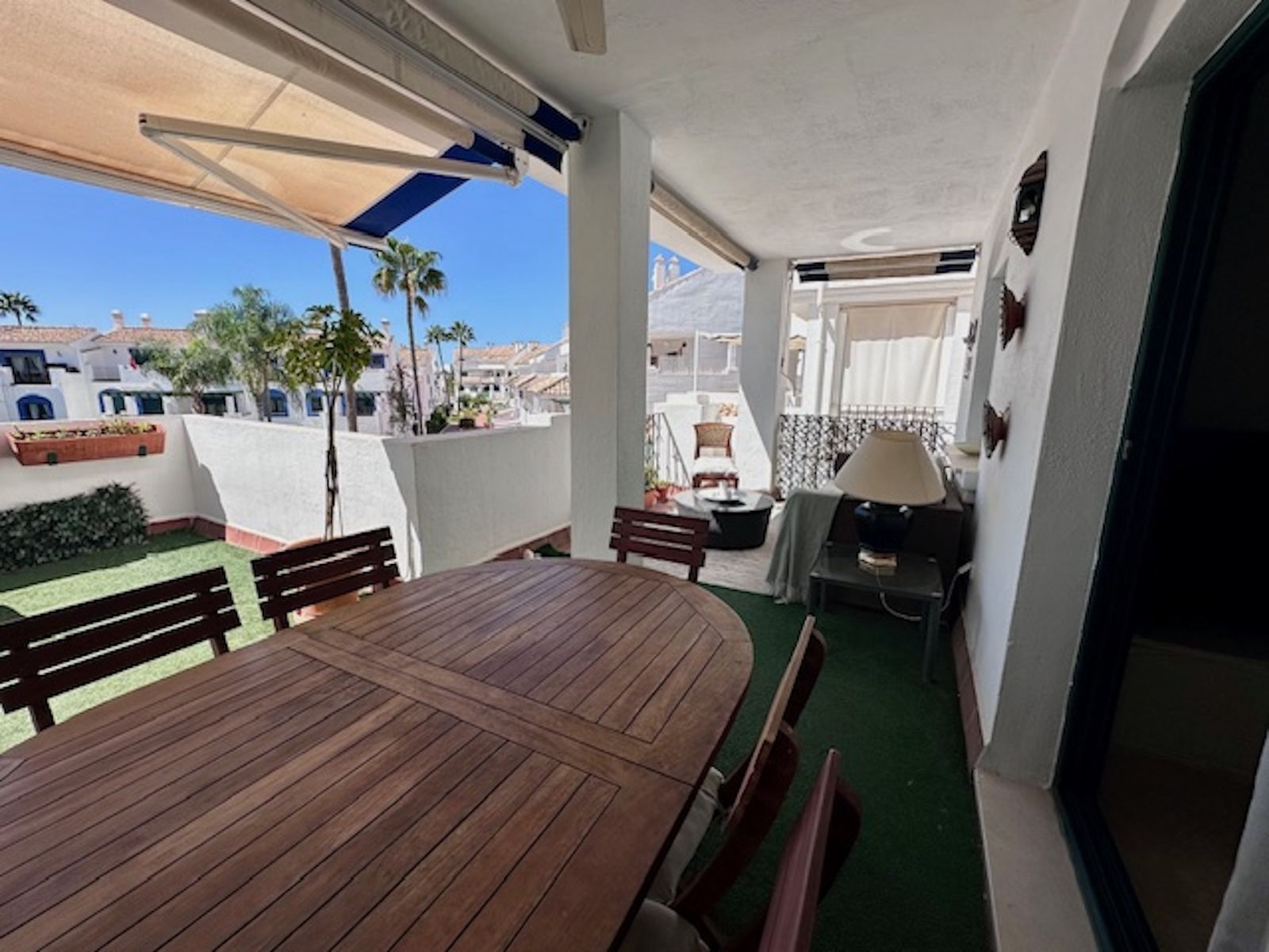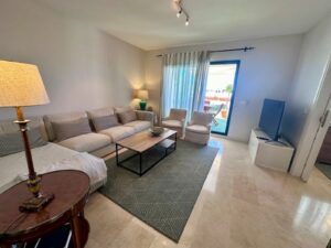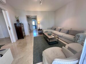 The living room opens onto a magnificent terrace, which is fully covered with awnings for winter use and offers stunning views of the development's pool and the sea, as this development is located on the beachfront.