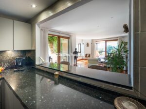 The designer kitchen, fully equipped with high-end appliances, blends harmoniously into the living area.