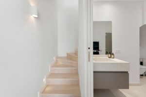 On the main floor, the apartment reveals a spacious open-plan design integrating a state-of-the-art kitchen fitted with high-end Gaggenau appliances, a welcoming living room, and an elegant dining area. This seamless flow continues into three additional bedrooms, two of which are en-suite, enhancing both comfort and privacy. From the main and secondary bedrooms, residents can step onto a generous terrace, where panoramic views of the Mediterranean Sea and surrounding mountains create a breathtaking backdrop. This terrace is ideal for morning coffee, evening sunsets, or simply unwinding in the gentle coastal breeze.