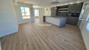Upon entering the home, you are welcomed by a spacious and light-filled area that can be used as a sitting room, reading nook, or even a play area for children. To the left, you’ll find three generously sized bedrooms with built-in wardrobes and two fully renovated bathrooms. Further along is a large, brand-new kitchen designed by Cocinas Schmidt, featuring state-of-the-art appliances and a central island. The kitchen flows seamlessly into a spacious dining area and additional living space, all opening out to a large terrace with views of the pool and distant sea.