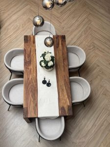 The main level offers a bright open-plan living and dining area with beautiful flooring, designer fireplace and large glass doors opening