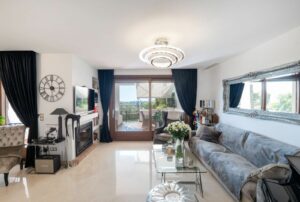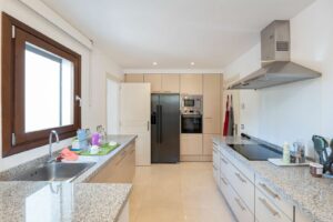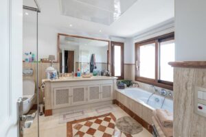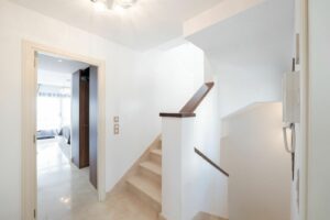 The townhouse includes a total of four bedrooms. Two bedrooms are located on the first floor, and two are in the basement. The master bedroom on the first floor boasts its own walk-in closet and en-suite bathroom. The adjacent bedroom also has its own bathroom. Both bedrooms offer stunning views of the sea and mountains.