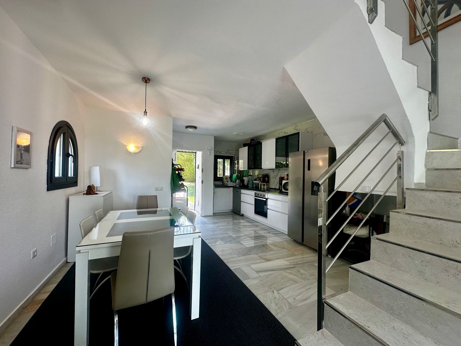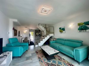 The bright and cozy living room is connected to an open-plan kitchen, creating a comfortable and functional space for everyday living. From here, there is direct access to a beautiful terrace with sea views, perfect for outdoor dining or evening relaxation.