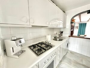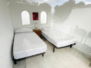 The ground floor houses the sleeping area, consisting of three bedrooms and two bathrooms, one of them en-suite in the master bedroom. Both the master bedroom and one of the secondary bedrooms have direct access to a private garden of approximately 50 m², an intimate and pleasant space that connects directly to the community pool, ideal for enjoying the climate and outdoor living.