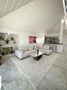 The fully equipped open-plan kitchen with separate pantry connects with a bright living room, with direct access to the private terrace and garden, enjoying open sea and nature views.