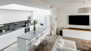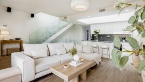 The property has been designed to prioritise natural light and comfort, creating a warm and inviting feel throughout. The main floor has an open plan layout with a sleek kitchen filled with sunlight from a feature skylight. The living area opens out to private terraces that extend the sense of space and provide the perfect setting for outdoor dining or quiet moments in the sun. With four bedrooms and three stylish bathrooms arranged over the ground and first floor, the home suits both year round living and holidays with family or friends. The house is set across three storeys and includes a generous basement that can be adapted to many different uses.