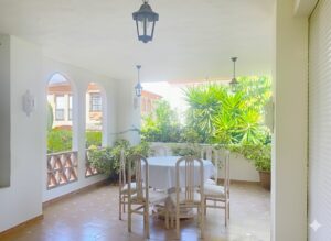 The private plot features two patios. The entrance patio includes a porch and a covered carport for two vehicles, providing access to the house. On the main floor, the property offers a spacious living-dining room with a fireplace and marble floors, creating an elegant and welcoming atmosphere. The kitchen, semi-open in style and fully equipped for daily use, connects both to the dining area and the entrance patio. This floor also includes a guest toilet for added convenience. From the living-dining room, there is access to a 40 m² covered terrace, perfect for enjoying the Mediterranean climate. Downstairs, the terrace connects to the front patio—a space with abundant vegetation and shade that, in addition to having side access from the street and offering an independent entrance to the guest apartment, features a gate with direct access to the communal swimming pool.
