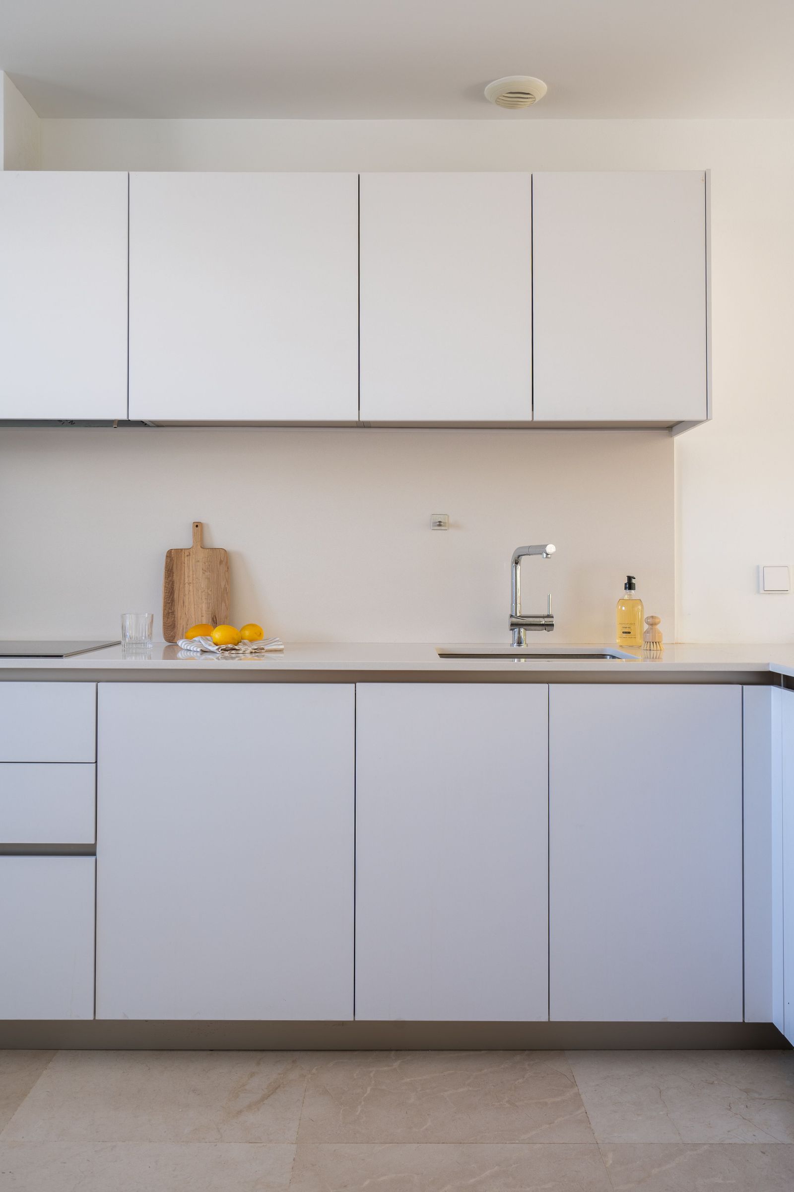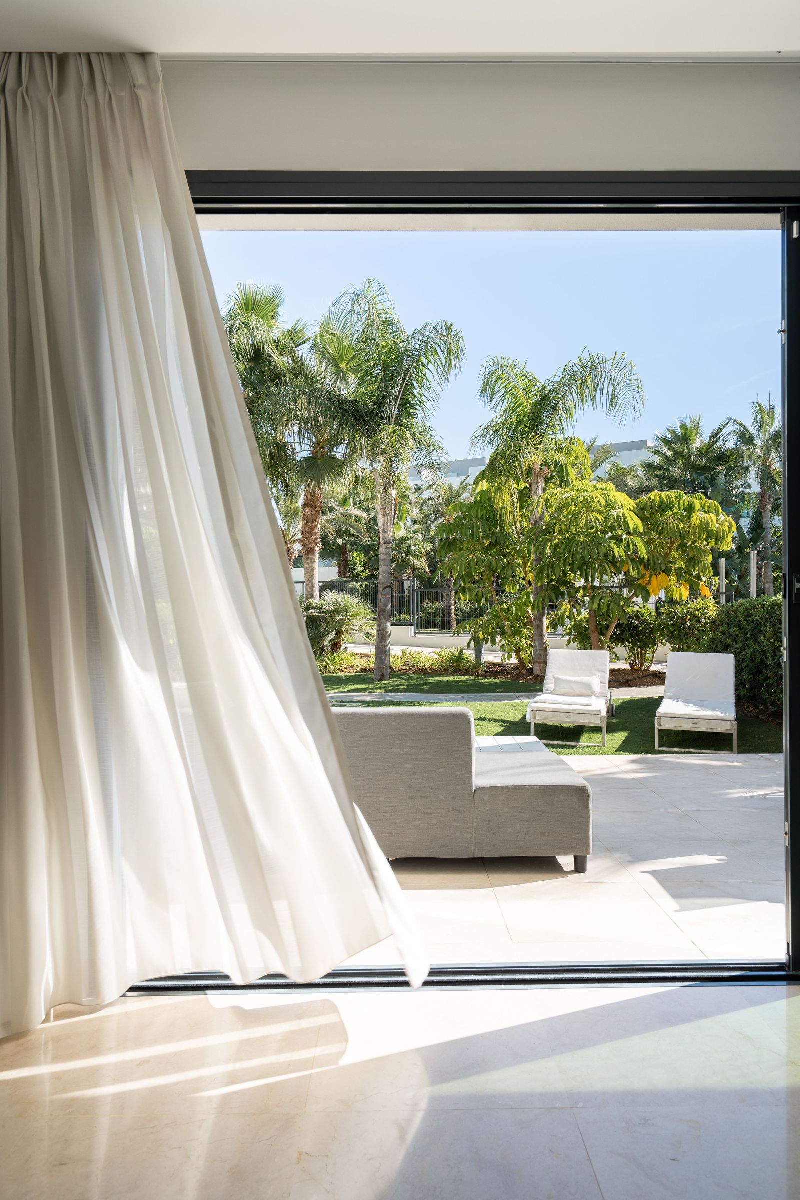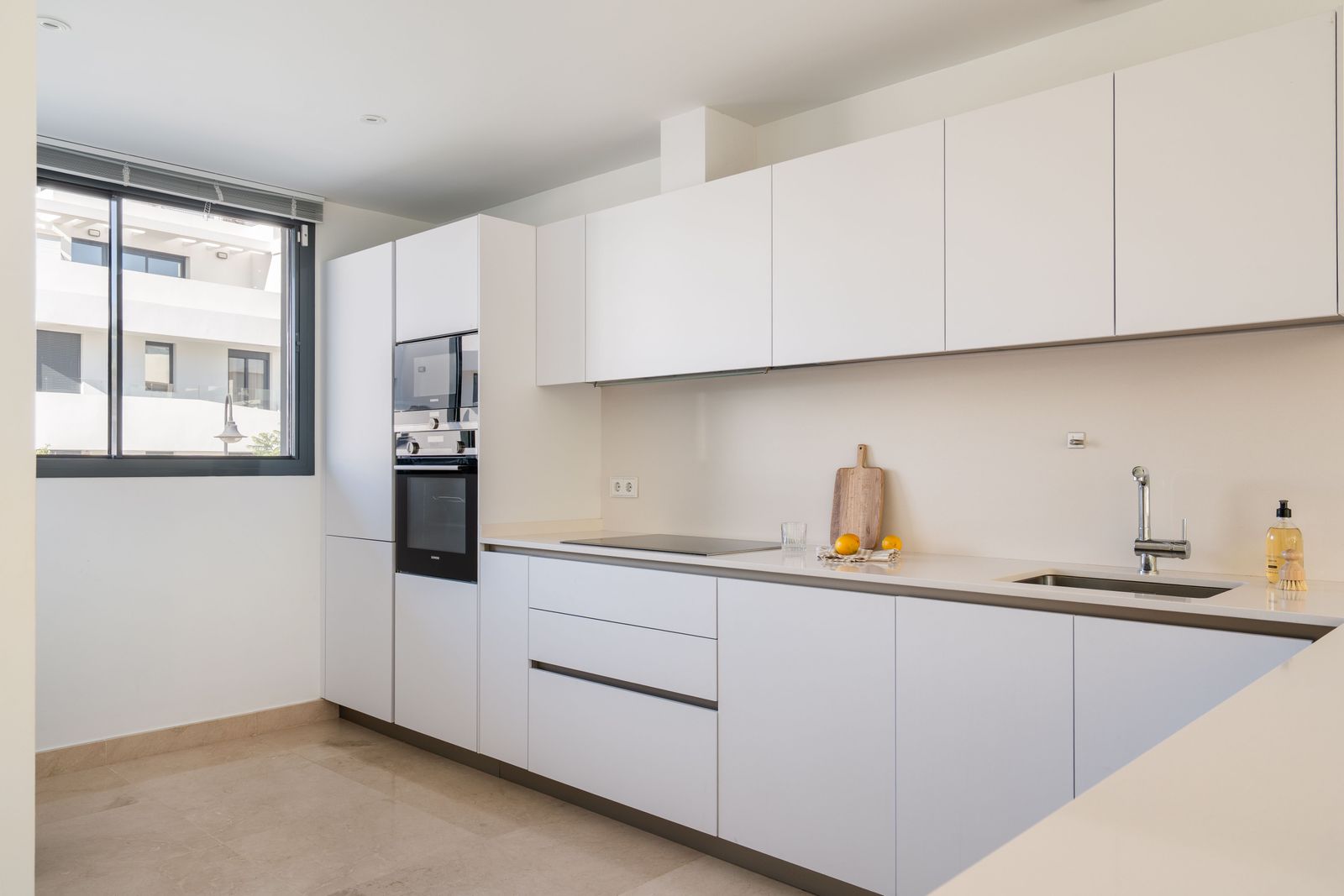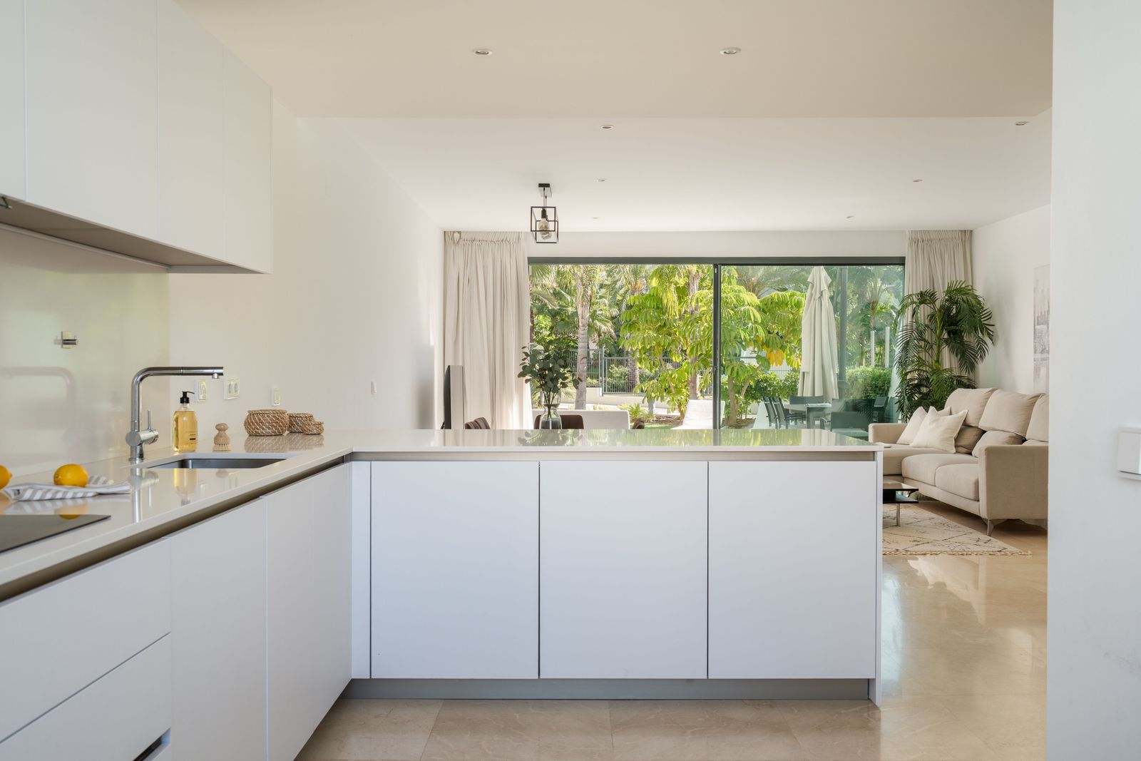 High-quality finishes: luxury kitchen, Villeroy & Boch bathrooms with Grohe fittings, and elegant white marble flooring extending to the terraces.