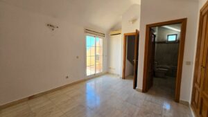 The upper level contains three large double bedrooms, each equipped with ample fitted wardrobes. The master bedroom has a private terrace and an en-suite bathroom. The second bedroom also features a terrace, and the third bedroom is generously proportioned. A family bathroom completes this floor.
