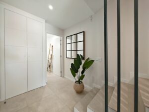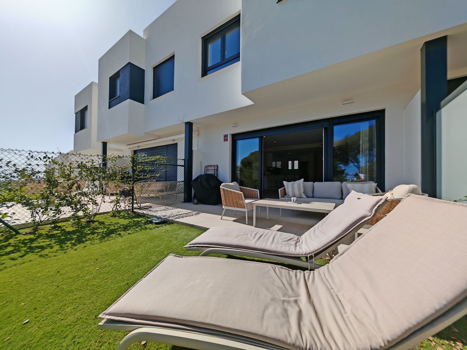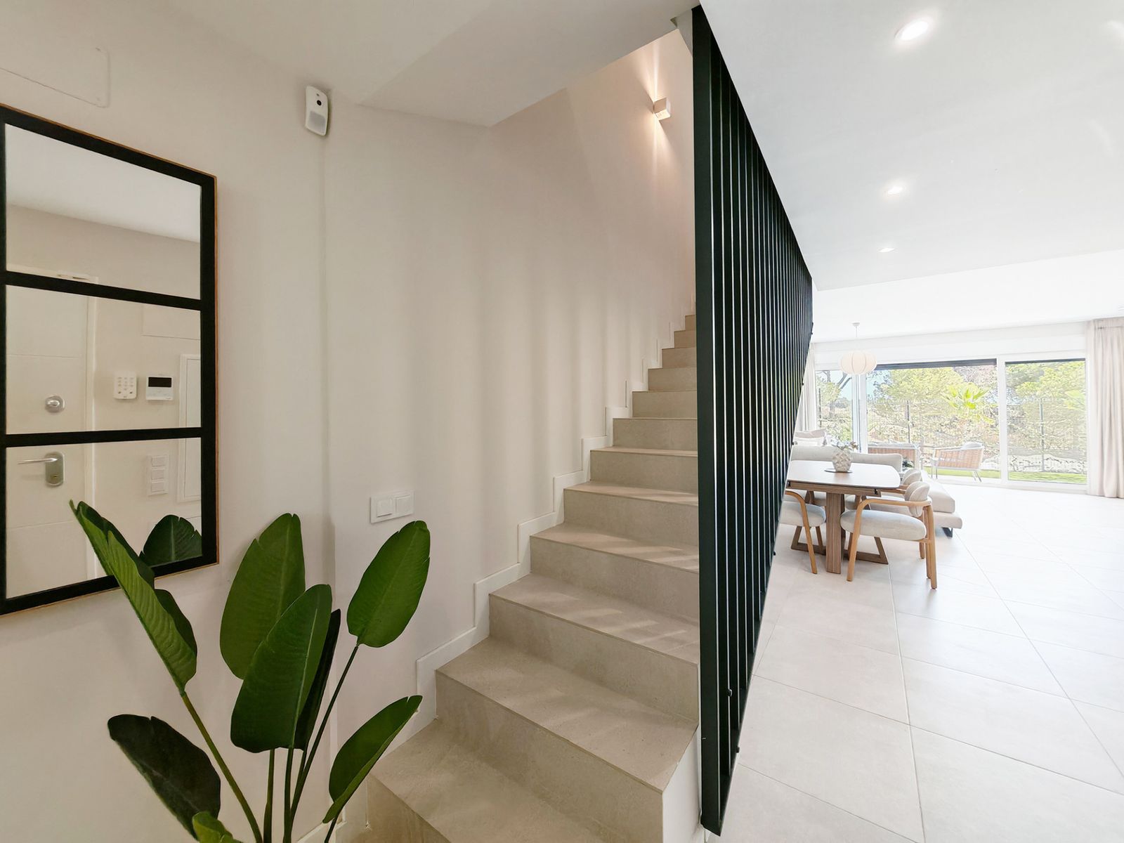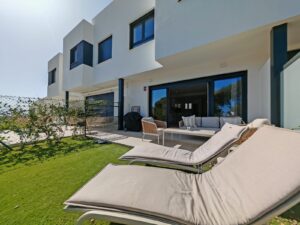 Town House for sale in , Mijas Costa with 4 bedrooms, 2 bathrooms, 1 on suite bathroom, 1 toilet and with orientation south, with communal swimming pool, private garage and private garden. Regarding property dimensions, it has 150 m² built, 119 m² interior and 22 m² terrace. Has the following facilities transport near, air conditioning, fully fitted kitchen, jacuzzi, sauna, guest room, storage room, gym, alarm, solarium, security entrance, double glazing, video entrance, brand new, security service 24h, guest toilet, living room, study room, sea view, heated pool, automatic irrigation system, security shutters, smart home system, dolby stereo surround system, laundry room, internet – wi-fi, covered terrace, 24h service, electric blinds, fitted wardrobes, gated community, garden view, underfloor heating (bathrooms), underfloor heating (partial), close to children playground, close to sea / beach, close to golf, uncovered terrace, glass doors, balcony, optional furniture, spa, wheelchair-accessible, excellent condition, ceiling cooling system, close to shops, close to town, close to schools, surveillance cameras, office room and pets allowed.