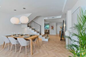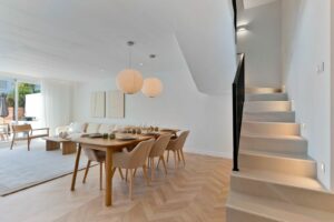 Inside, the ground floor spans nearly 80 m², comprising a stylish open-plan kitchen, spacious living room, entrance hall, and guest toilet. Scandinavian design principles define the space, with carefully selected, high-quality modern materials. Under the staircase, there’s a custom wine storage area. All rooms are fitted with individually controlled Airzone systems for both heating and cooling, while underfloor heating is installed in all bathrooms. Wet areas are finished with tasteful, full-height tiles in a warm beige tone.