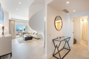 Ascending to the third level, the magnificent rooftop solarium serves as the home’s crown jewel. This luxurious space offers a jacuzzi, a sauna, and a fully equipped outdoor kitchen, all set against panoramic views of Nueva Andalucía and the Mediterranean Sea, a spectacular backdrop for both daytime lounging and sunset gatherings.